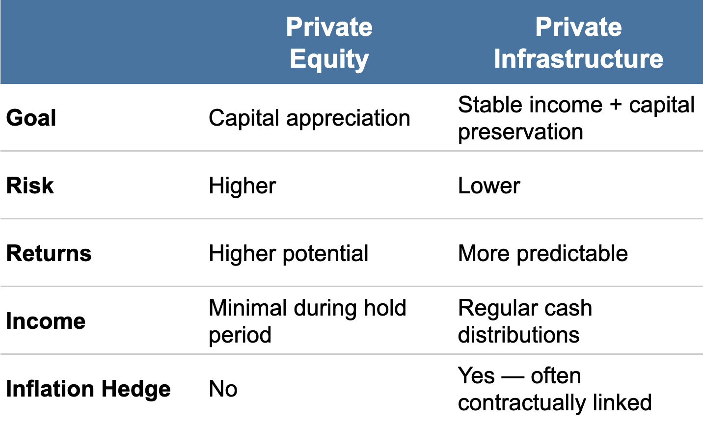 Clients often ask us about the differences between private equity and private infrastructure — so we’re breaking down the key distinctions and how to think about each when investing in private markets.