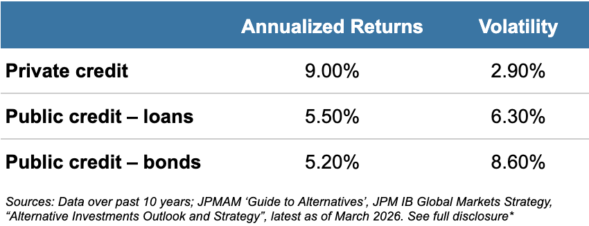 *Data over past 10 years; JPMAM ‘Guide to Alternatives’, JPM IB Global Markets Strategy, “Alternative Investments Outlook and Strategy”, latest as of March 2026. Source: JPMAM Guide to Alternatives, Bloomberg, Cliffwater, Gilberto-Levy, Preqin. Direct Lending: Cliffwater Direct Lending Index; Distressed Debt: Preqin Quarterly Distressed Debt index; Investment Grade: Bloomberg US Aggregate Credit - Corporates - investment Grade Index; High Yield: Bloomberg US Aggregate Credit - Corporate - high Yield Index; Leveraged loans: JP MOrgan Leveraged Loan Index; Mezzanine Debt: Preqin Quarterly Mezzanine Debt Index. Annualized return and volatility represents a 40-quarter period ending 12/31/2024. Data are based on availability as of January 31, 2026. (Originals: https://privatebank.jpmorgan.com/apac/en/insights/markets-and-investing/private-credit-under-the-microscope-separating-headlines-from-fundamentals, https://privatebank.jpmorgan.com/eur/en/insights/markets-and-investing/ideas-and-insights/the-good-news-behind-the-bad-private-credit-headlines)