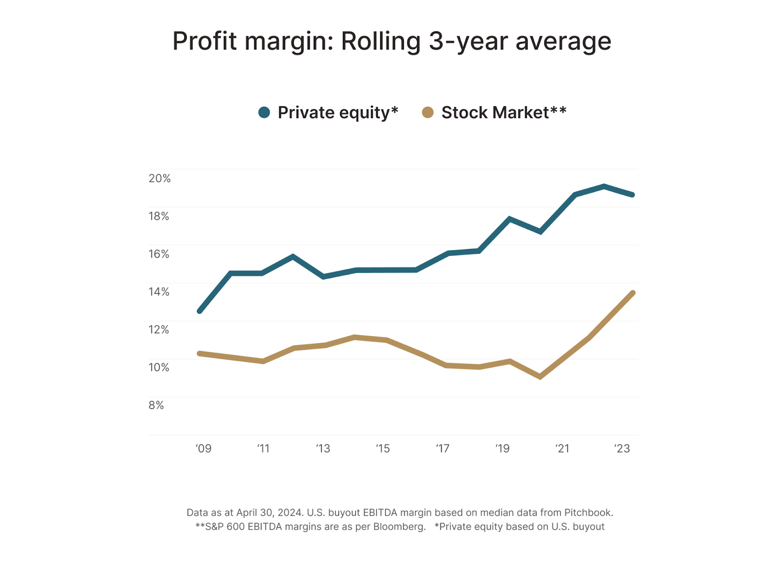 Private equity-backed companies have the potential to deliver investors returns via higher profit margins. Private equity-backed firms have historically shown profit margins of around 2-4% higher than public companies.