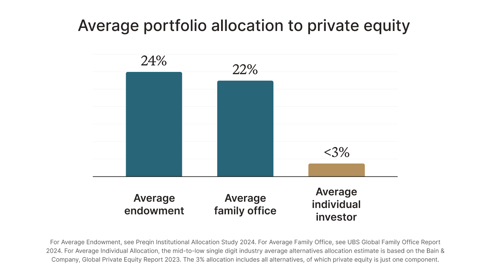 Recent estimates from Preqin, UBS, and Bain & Company show that institutions allocate far more of their portfolio into private equity. Generally, the key reasons for such under-allocation to private equity by individual investors have been lack of access, high minimum investments, multi-year lockup periods, and cash drag due to capital calls in traditional private equity fund structures. Now, at Heron we make investing in private equity easier for individual accredited investors.