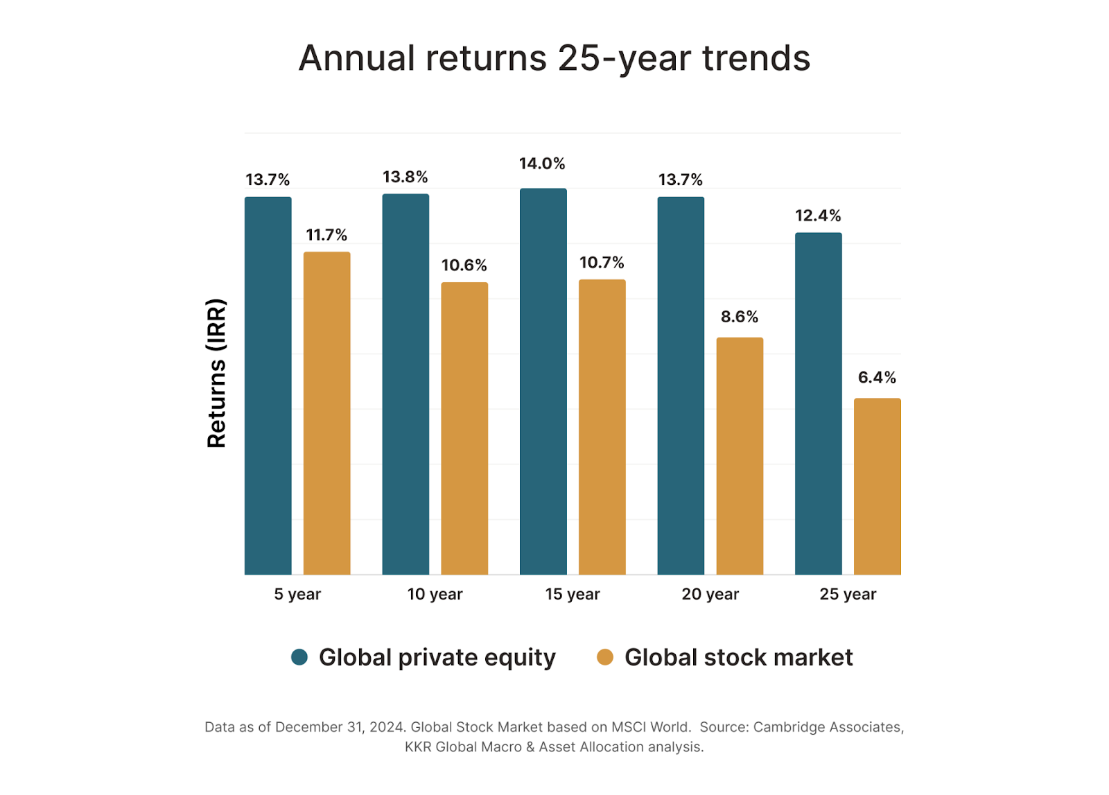 Over the past 25-year period, ending on December 31, 2024, private equity has almost doubled global stock market returns, and has historically outperformed the stock market across time periods.