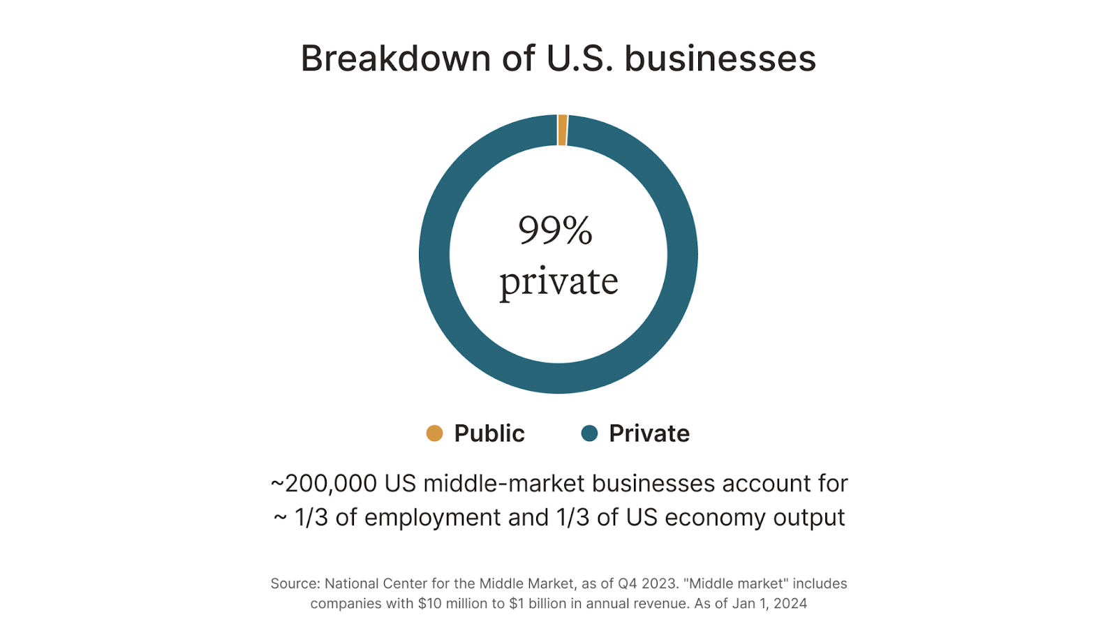 Private equity provides an opportunity to diversify that the stock market simply can’t. In fact, the stock market is increasingly more concentrated, with about 40% of the S&P 500’s total market capitalization made up of just 10 companies. Approximately 99% of U.S. businesses are privately held, and at the heart of this are roughly 200,000 middle-market companies. Together, these firms generate about one-third of all U.S. employment and roughly one-third of total economic output.