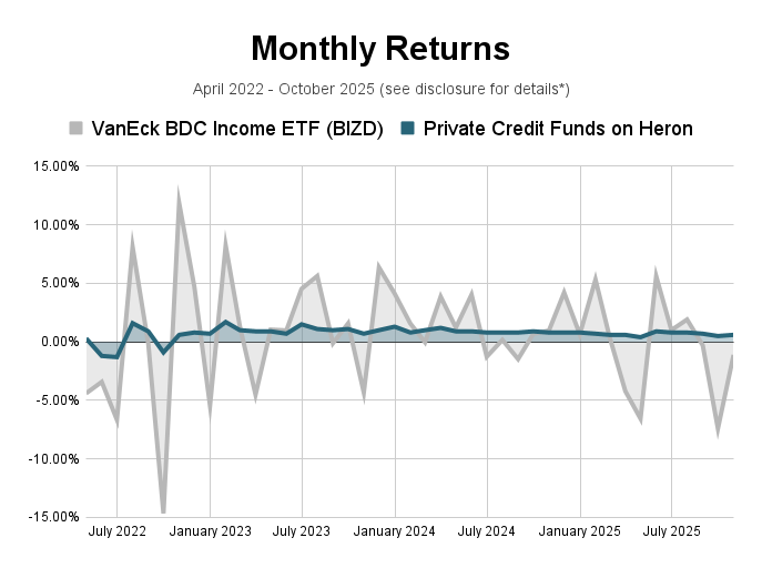 Take a look at the monthly total returns comparing funds available on Heron to the VanEck BDC Income ETF: