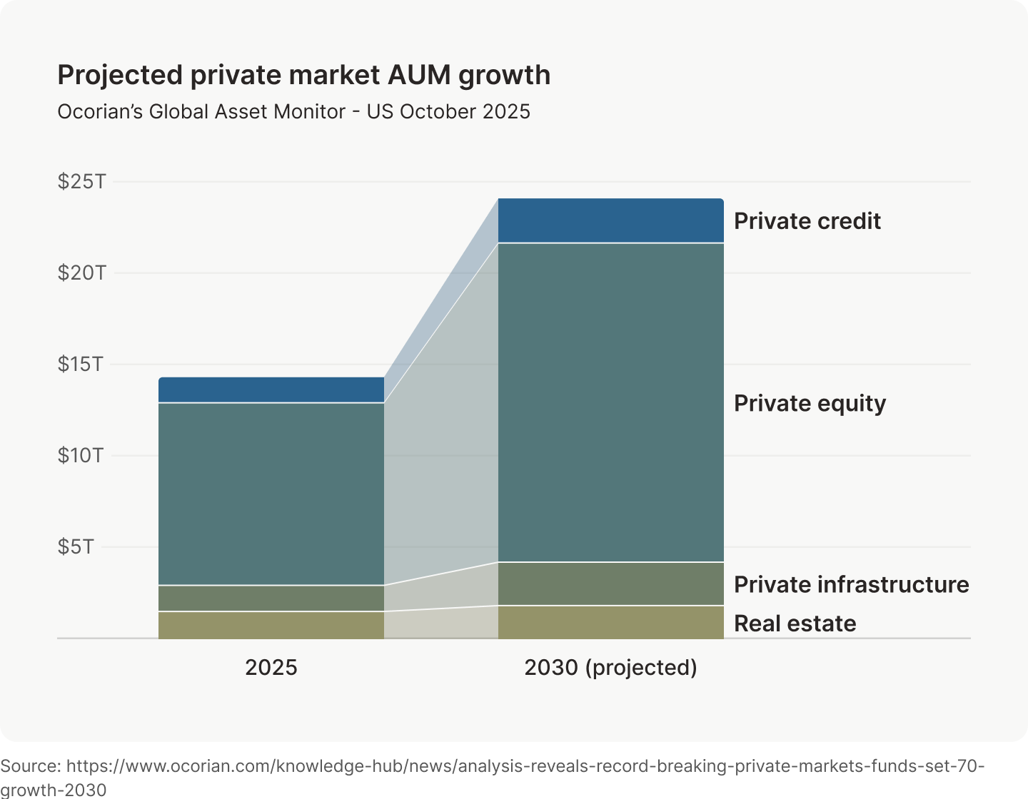 The growth in private sector companies and demand from investors for diversified sources of returns positions private markets to continue its growth spurt into the future. In fact, private markets are estimated to add another $10 trillion in AUM by 2030.