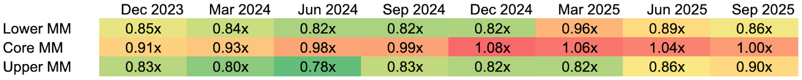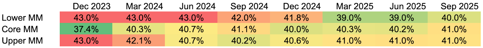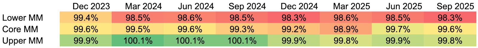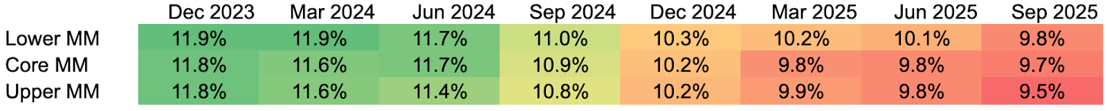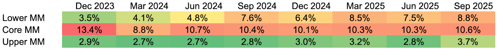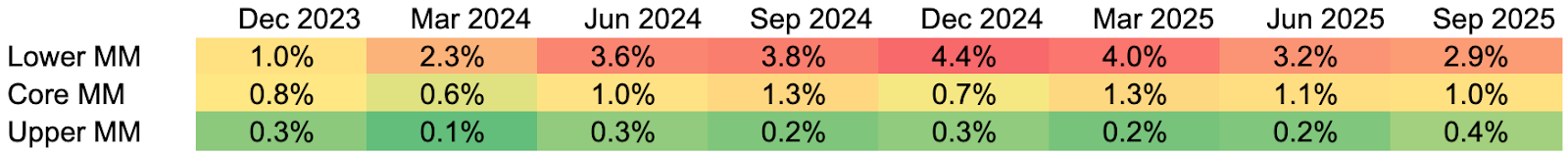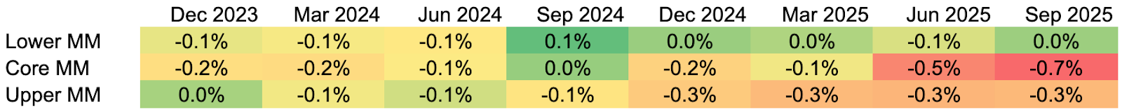 Data sources: All metrics are calculated as of Q3 2025 as the median quarterly fund data, based on SEC filings and fund reporting from 71 private credit funds managed by firms with greater than $1 trillion in aggregate private credit AUM. Lower MM refers to lower middle market companies, which report annual EBITDA of less than $25 million; core MM refers to core middle market companies, which report annual EBITDA greater than $25 million but less than $75 million; and upper MM refers to upper middle market companies, which report annual EBITDA greater than $75 million.