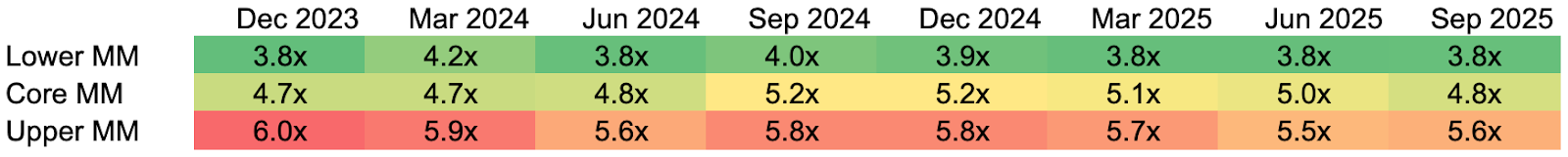 Leverage levels have been broadly stable, with no material upward drift. This suggests lenders have maintained discipline on borrower leverage despite competitive deal markets, and that the borrower balance sheet has remained relatively stable in the last two years.