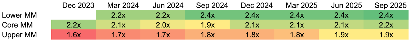 Leverage levels have been broadly stable, with no material upward drift. This suggests lenders have maintained discipline on borrower leverage despite competitive deal markets, and that the borrower balance sheet has remained relatively stable in the last two years.