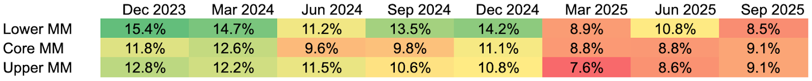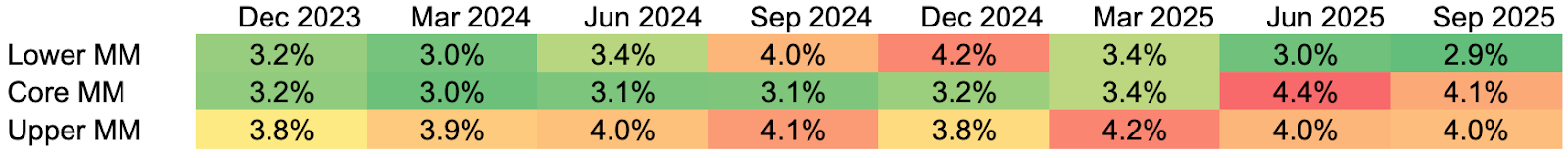 Data sources: All metrics are calculated as of Q3 2025 as the median quarterly fund data, based on SEC filings and fund reporting from 71 private credit funds managed by firms with greater than $1 trillion in aggregate private credit AUM. Lower MM refers to lower middle market companies, which report annual EBITDA of less than $25 million; core MM refers to core middle market companies, which report annual EBITDA greater than $25 million but less than $75 million; and upper MM refers to upper middle market companies, which report annual EBITDA greater than $75 million.
