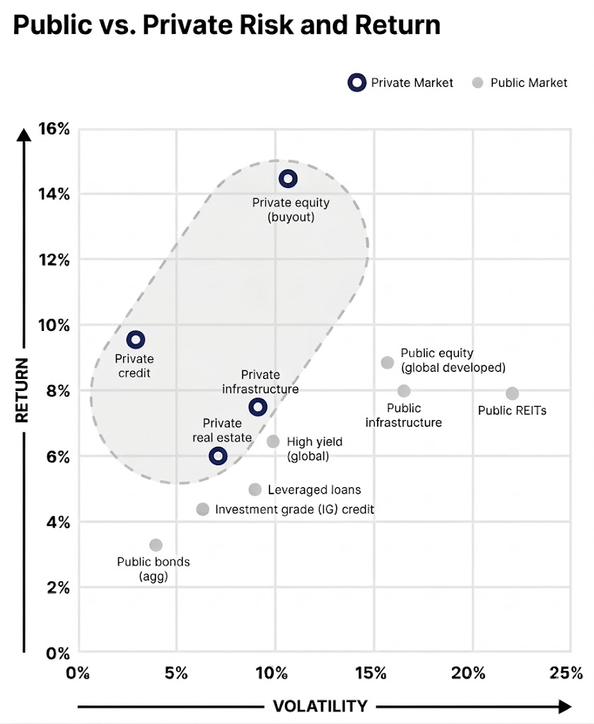 Private credit, private equity, private infrastructure, and private real estate don't all move in lockstep. They have different goals with different risk/return profiles — and that's the point.